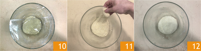Couvrez la pâte avec du film alimentaire 10 ou un torchon et laissez reposer pendant 10 minutes à température ambiante. Passés ces 10 minutes, dans le même bol réalisez les premières pliures de la pâte en la soulevant par les côtés 11 et en la ramenant vers le centre, puis laissez-la reposer 10 minutes à température ambiante. Répétez cette opération pour un total de 4 fois. La dernière fois, laissez votre pâte lever dans un bol à température ambiante 12, couverte de film, pendant environ 2 heures.