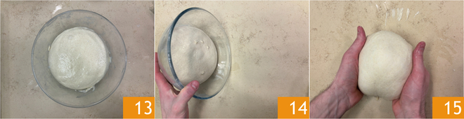 Reprenez la pâte levée 13. Retournez-la sur un plan de travail 14 ou sur un plan légèrement huilé et faites les dernières pliures 15.