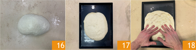 Formez un pâton de forme allongée 16. Dans une plaque à four de 30x40 cm légèrement huilée, déposez la pâte 17 et laissez-la doubler de volume, cela prendra environ 30 minutes. Dès qu'elle est prête, étalez la pâte en l'élargissant avec les doigts 17.
