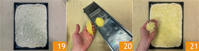 Laissez les bords hauts 19. À ce stade, vous pouvez passer à la préparation des pommes de terre, en les tranchant en rondelles de 2 mm avec une mandoline 20. C'est le moment d'assaisonner la pizza avec la mozzarella en lanières 21, en la répartissant uniformément sur la surface 21.
