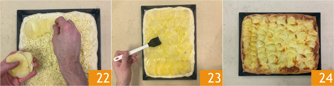 Déposez par-dessus les pommes de terre tranchées précédemment 22 et badigeonnez la surface avec de l'huile 23. Faites cuire 30 minutes à 250° en four statique. Sortez du four lorsque les pommes de terre sont dorées 24 et servez la pizza aux pommes de terre bien chaude !