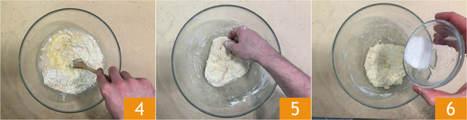 Rassemblez les ingrédients avec une cuillère 4, puis travaillez à la main pendant environ 5 minutes. Quand vous aurez obtenu une pâte homogène, procédez ainsi : soulevez un pan de pâte sur le bord extérieur et ramenez-le vers le centre, jusqu'à former le réseau glutineux. Au début elle paraîtra très brute et rustique 5. À ce stade, ajoutez le sel 6.