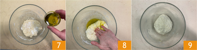 Ajoutez aussi l'huile 7 et travaillez énergiquement 8 jusqu'à absorption complète des deux ingrédients 9.