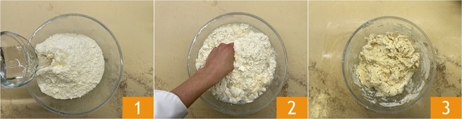 Pour préparer la pizza à la crème de poivrons et spianata, commencez par la pâte : dans un bol, versez la farine 00 et 550 g d'eau 1. Pétrissez énergiquement à la main 2 jusqu'à absorption complète 3. Laissez reposer une heure à température ambiante, couvert d'un film.