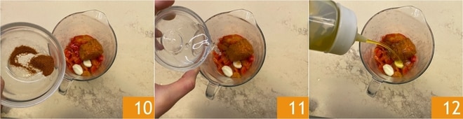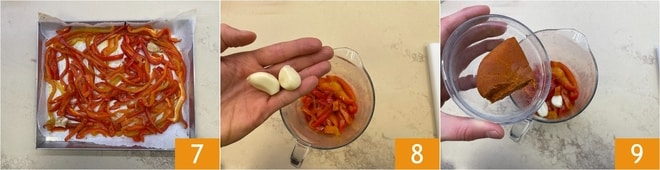 Sortez-les du four 7, retirez les gousses d'ail et laissez légèrement tiédir. Transférez les poivrons cuits dans un verre doseur, ajoutez 2 gousses d'ail crues 8 et la nduja 9.