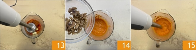 Mixez avec un mixeur plongeant 13, puis ajoutez aussi les cerneaux de noix 14 et mixez de nouveau pour obtenir une consistance crémeuse 15. Réservez la crème de poivrons.