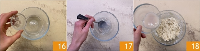 Dissolvez la levure émiettée dans les 50 g d'eau restants 16, en mélangeant avec une cuillère 17. Ajoutez le mélange d'eau et de levure à la pâte 18.