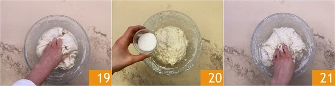 Commencez à pétrir énergiquement 19, puis ajoutez le sel 20 et continuez à travailler pour l'incorporer de manière homogène 21.