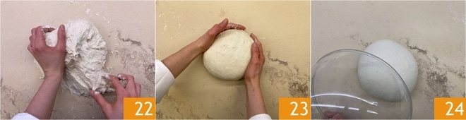 Transférez la pâte sur le plan de travail et continuez à pétrir 22 jusqu'à obtenir une boule lisse et homogène, non collante 23. Laissez reposer 30 minutes à température ambiante, sur le plan de travail, couvert avec le bol 24.