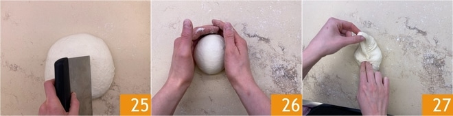Après ce temps, divisez la pâte en 6 boules de 250 g chacune 25. Donnez des plis de renfort 26 et formez une boule 27.