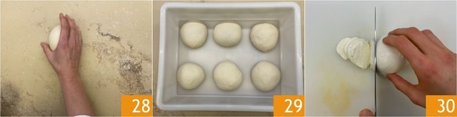 Boulez les boules pour obtenir des petites boules 28, puis placez-les dans un récipient pour la levée 29. Laissez lever à température ambiante (ou dans un four éteint avec la lumière allumée) jusqu'à ce qu'elles doublent de volume, environ 2 heures. Coupez le fiordilatte en tranches 30.