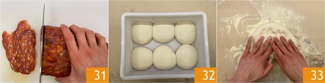 Tranchez également finement la spianata calabraise 31. Récupérez les boules levées 32 et étalez-les avec les mains sur le plan de travail légèrement fariné, en étendant la pâte avec les doigts 33.