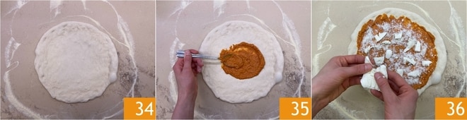 Étalez la boule jusqu'à atteindre un diamètre d'environ 30 cm 34. Étalez la crème de poivrons sur la surface 35, puis assaisonnez avec du pecorino râpé et des morceaux de fiordilatte 36.