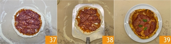 Complétez avec les tranches de spianata 37. Faites cuire la pizza sur une pierre réfractaire, dans un four statique préchauffé à 250° pour environ 8-10 minutes, sur la grille la plus haute du four. Sortez-la du four 38 et servez chaude votre pizza à la crème de poivrons et spianata, parfumée avec des feuilles de basilic frais 39 !