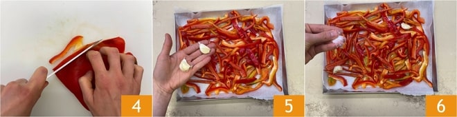 Entre-temps, nettoyez les poivrons en éliminant la tige, les graines et les filaments internes, puis coupez-les en fines lanières 4. Transférez les poivrons tranchés dans une plaque recouverte de papier sulfurisé, assaisonnez avec 2 gousses d'ail 5, de l'huile, du sel 6 et du poivre. Faites cuire dans un four statique préchauffé à 250° pour 10 minutes.