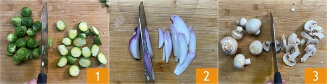 Pour réaliser la pizza de polenta, commencez par préparer les légumes : nettoyez les choux de Bruxelles et coupez-les en deux 1, puis épluchez l'échalote et coupez-la en lamelles 2. Éliminez la base terreuse des champignons de Paris et coupez-les également en tranches 3.