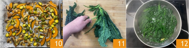 Disposez les légumes sur une plaque recouverte de papier cuisson et faites cuire dans un four statique préchauffé à 220° pendant 20-25 minutes 10. Pendant ce temps, préparez la crème de chou noir : retirez la nervure centrale des feuilles de chou noir 11, puis blanchissez-les pendant 3-4 minutes 12.