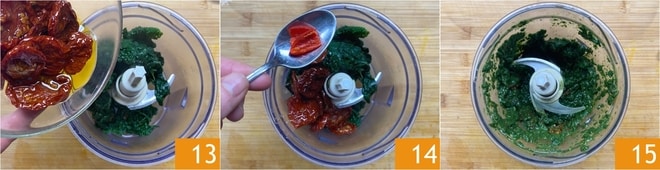 Égouttez le chou noir et transférez-le dans un mixeur, puis ajoutez les tomates séchées avec leur huile 13 et le piment 14. Mixez jusqu'à obtenir une consistance crémeuse et réservez 15. Coupez la mozzarella en tranches et mettez-la dans une passoire pour égoutter l'excès d'eau.