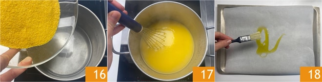 Pour préparer la polenta, portez à ébullition une casserole d'eau avec 3 cuillères à café de sel, puis versez la farine en pluie 16. Faites cuire pendant le temps indiqué sur l'emballage, en remuant avec le fouet 17. Huilez une plaque recouverte de papier cuisson 18.
