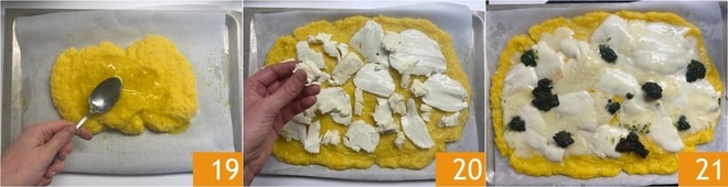 Une fois prête, versez la moitié de la polenta sur la plaque (la dose est pour 2 plaques) et égalisez-la avec le dos d'une cuillère, si nécessaire en vous aidant avec un peu d'huile 19. Assaisonnez la surface avec la moitié de la mozzarella en tranches et la moitié du taleggio en morceaux 20, puis ajoutez des touffes de crème de chou noir. Enfournez à 210° en mode statique pendant 10 minutes, puis sortez du four et laissez reposer quelques minutes. Passez au mode grill et enfournez à nouveau pendant 2 minutes pour faire gratiner le fromage 21.