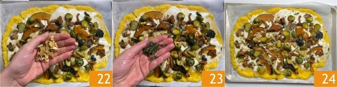 À ce stade, sortez du four et répartissez la moitié des légumes, puis garnissez avec les noix 22 et le thym 23. Remettez la plaque sous le grill pendant 3-5 minutes, puis complétez avec un tour de moulin à poivre. Procédez de la même manière pour préparer la deuxième plaque et servez votre pizza de polenta encore chaude 24 !