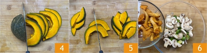 Lavez la courge et tranchez-la finement sans la peler 4, puis divisez les tranches en deux 5. Rassemblez tous les ingrédients dans un bol et ajoutez également les girolles, que vous aurez nettoyées délicatement avec un chiffon humide 6.