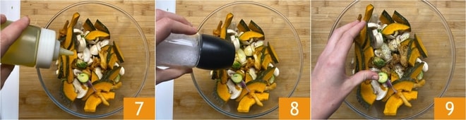 Assaisonnez avec de l'huile 7, du sel 8 et du poivre, puis mélangez en massant le tout avec les mains 9.