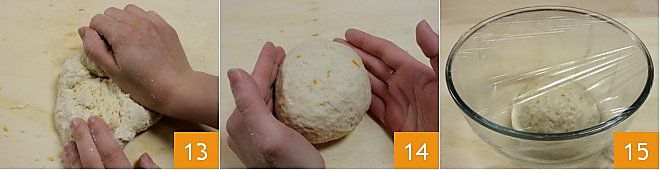 Pétrissez énergiquement avec les mains 13 pour obtenir une pâte lisse et douce avec laquelle vous formerez une boule 14. Placez-la dans un bol couvert de film plastique et laissez lever pendant au moins 3 heures à température ambiante 15.