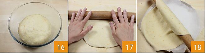 Après le temps nécessaire, la pâte aura doublé de volume 16. Ensuite, mettez-la sur un plan fariné et étalez-la avec un rouleau à pâtisserie 17 pour obtenir un disque de pan brioche de 1 cm d'épaisseur et de 34 cm de diamètre. Prenez un moule de 34 cm de diamètre et tapissez-le de papier sulfurisé. Déposez le disque de pan brioche dans le moule avec l'aide du rouleau à pâtisserie 18.