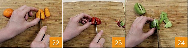En attendant, commencez à préparer les fruits pour garnir la pizza : lavez bien chaque fruit, divisez les abricots en deux, retirez le noyau et coupez-les en quartiers 22. Divisez également la pêche en deux et coupez-la en petits dés; puis continuez avec les fraises, en enlevant les feuilles et en les coupant en deux 23. Ensuite, pelez le kiwi, coupez-le en deux et tranchez-le dans le sens de la largeur 24. Enfin, lavez également les cerises et les myrtilles qui serviront toujours à garnir la pizza.