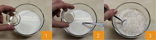 Pour préparer la pizza sucrée aux fruits, commencez par la base : divisez la dose de lait tiède en 2 petits bols : dans l'un, ajoutez à la moitié du lait le miel 1 et la levure (en alternative, vous pouvez utiliser 6 g de levure de boulanger fraîche) 2, en mélangeant pour les dissoudre avec une cuillère à café 3.
