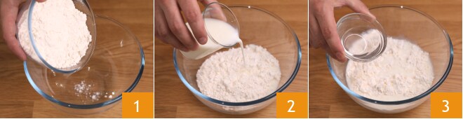 Pour préparer la pizza en plaque sans gluten, commencez par verser le mélange de farines sans gluten dans un grand bol 1, puis ajoutez le lait à température ambiante 2 et l'eau également à température ambiante 3.