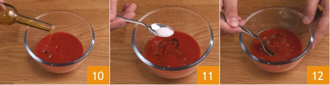Entre-temps, vous pouvez préparer l'assaisonnement : versez la purée de tomates dans un bol et assaisonnez avec de l'huile 10, du sel 11 et du poivre, puis mélangez bien 12 et réservez.