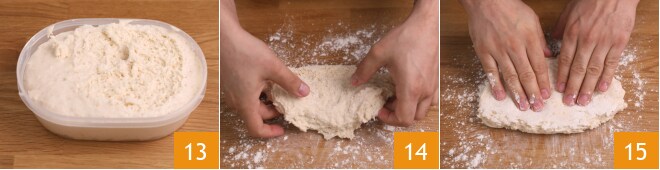 Une fois le temps de levée écoulé, reprenez la pâte qui sera ferme mais assez collante 13. C'est normal : renversez-la sur un plan de travail légèrement fariné en vous aidant d'une raclette. Retournez la pâte de l'autre côté 14 et aplatissez-la légèrement avec vos doigts 15.