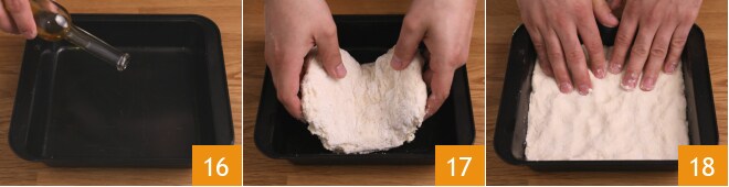 Huilez avec de l'huile un moule de 20x20 cm à la fois à la base et sur les bords 16, puis transférez la pâte à l'intérieur 17. Aplatissez avec vos doigts pour étendre la pâte sur toute la surface du moule, mais faites attention à ne pas trop l'étirer car, en n'ayant pas de gluten, elle pourrait se déchirer 18.