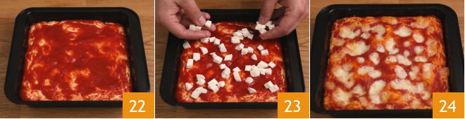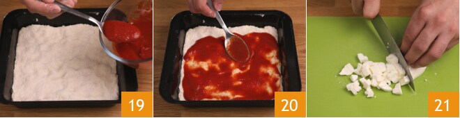 Ajoutez la tomate sur la surface 19 en la répartissant uniformément avec le dos d'une cuillère 20, puis laissez lever à température ambiante pendant encore 2 heures. Si l'assaisonnement est un peu sec, couvrez le moule avec un torchon. Pendant ce temps, réduisez la mozzarella en dés 21.