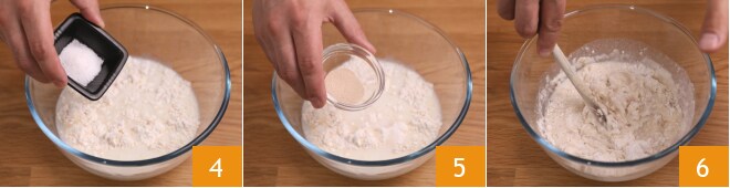 Ajoutez également le sel 4 et la levure de bière sèche sans gluten 5 (en alternative, vous pouvez émietter 10 g de levure fraîche, en vous assurant toujours d'acheter des produits avec l'épi barré), puis commencez à mélanger avec une cuillère en bois 6.
