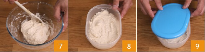 Vous devez obtenir une pâte humide mais consistante et homogène 7. À ce stade, transférez la pâte dans un contenant avec un couvercle qui soit au moins deux fois plus haut que le mélange 8, fermez 9 et laissez lever à température ambiante pendant environ 2 heures.