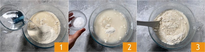 Pour préparer la pizza sans levure, versez la farine dans un grand bol, puis ajoutez l’eau 1 et le sel 2. Mélangez le tout avec une cuillère en bois 3.