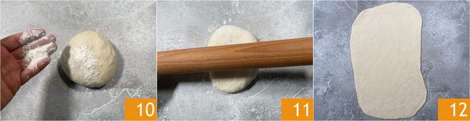 Après ce temps, prenez une boule à la fois, en veillant à garder l'autre couverte, et saupoudrez-la légèrement de farine des deux côtés 10. Étalez la pâte avec un rouleau à pâtisserie 11 pour former un rectangle de la même taille que la plaque 12. Si la pâte a tendance à se rétracter, ne la forcez pas mais attendez quelques minutes avant de l'étaler à nouveau avec le rouleau.