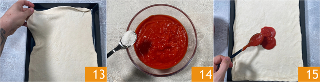 Transférez la pâte dans la plaque bien huilée et tirez-la délicatement pour qu'elle recouvre toute la surface 13. Maintenant, assaisonnez la purée de tomates avec du sel 14 et mélangez bien. Répartissez la tomate sur toute la surface de la pâte 14, y compris les bords.