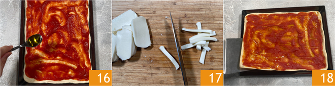 Arrosez d'un filet d'huile d'olive 15 et faites cuire la pizza dans un four statique préchauffé à 250° pendant 10 minutes, en plaçant la plaque en contact avec la partie basse du four. Pendant ce temps, coupez la mozzarella en bâtonnets 17. Après 10 minutes, sortez la plaque du four et transférez la pizza 18 directement sur la grille.