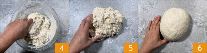 Une fois que le mélange est homogène, continuez à travailler avec les mains, d'abord dans le bol 4 puis sur le plan de travail 5. Vous devez obtenir une pâte lisse et homogène 6.