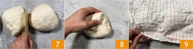 Divisez la pâte en deux avec une corne 7, formez des boules 8 et laissez-les reposer pendant 10 minutes, couvertes d'un torchon 9.