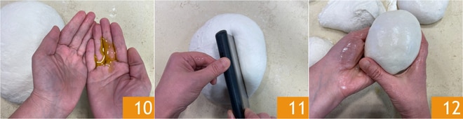 Huilez vos mains avec un filet d'huile 10 et divisez la pâte en 6 morceaux d'environ 250 g chacun 11, puis travaillez-les en tirant la pâte vers le bas, puis serrez-la entre l'index et le pouce 12 et “coupez-la”, c'est-à-dire coupez l'excès de pâte, comme pour les mozzarelles. Alternativement, vous pouvez bouler les pâtons.
