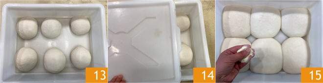 Placez les pâtons dans une boîte à levée 13, fermez avec un couvercle 14 et laissez lever pendant 4 heures à température ambiante. Une fois le temps de levée écoulé, saupoudrez la surface des pâtons de semoule 15.