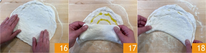 Transférez un pâton sur le plan de travail avec un voile de semoule, puis étalez-le avec les doigts en pressant sur toute la surface 16. Assaisonnez avec un filet d'huile et repliez lentement la pâte 17 pour former une demi-lune 18, en veillant à ce que la partie intérieure soit uniformément huilée. Faites cuire dans un four statique, à 250°C pendant environ 5-6 minutes, de préférence sur une pierre réfractaire préalablement chauffée.