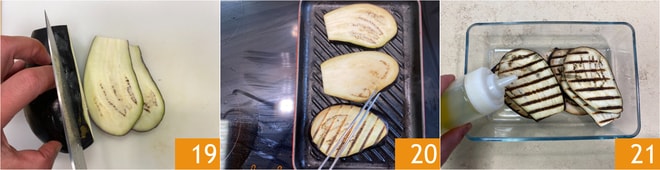 Passez à la garniture : coupez les aubergines en tranches d'environ 1 cm d'épaisseur 19, puis grillez-les pendant 3-4 minutes de chaque côté 20. Assaisonnez avec de l'huile 21, du basilic, du sel et du poivre.