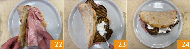 Sortez la pizza tacos du four et ouvrez-la doucement. Garnissez l'intérieur avec de la mortadelle 22, des aubergines grillées et de la stracciatella 23. Votre pizza tacos est prête à être dégustée 24 !