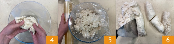 Déchiquetez le mélange avec les mains 4 et placez-le dans un bol. Couvrez de film plastique 5 et laissez reposer d'abord une heure à température ambiante puis pendant 24 heures au réfrigérateur, à 4°C. Une fois ce temps écoulé, sortez le préferment du frigo et laissez-le revenir à température ambiante pendant environ une heure, puis divisez-le en petits morceaux 6.